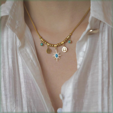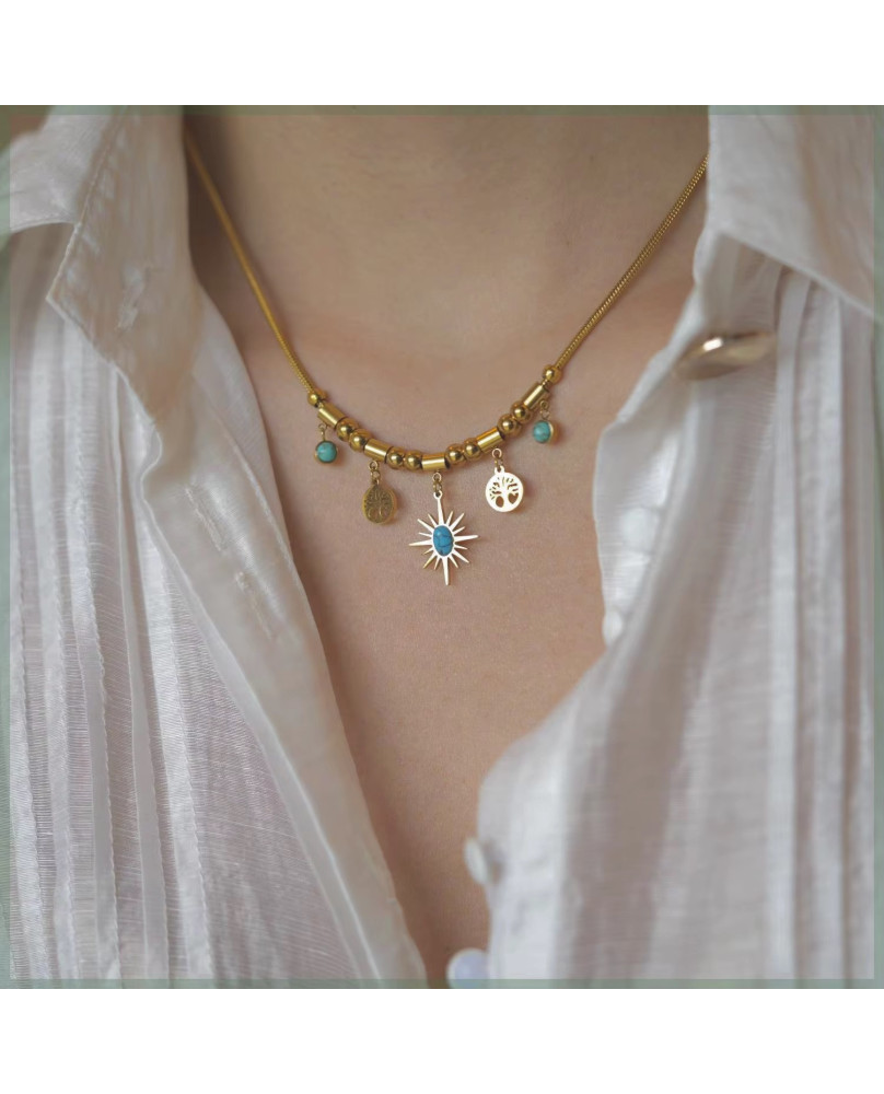 Połączenie złota i turkusu tworzy kompozycję pełną harmonii - jednocześnie elegancką, kobiecą i zanurzoną w klimacie boho luksusu. Naszyjnik doskonale wygląda zarówno solo, jak i w zestawie z bransoletką z tej samej serii, z którą tworzy spójny, magnetyzujący komplet przyciągający spojrzenia.